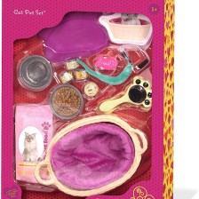 Un kit d'accessoire chat qui comprend: un panier, un jouet pour chat, un sac de nourriture pour chat, un bol pour la nourriture, un bol pour l'eau, une brosse, un poisson pour jouer, une balle, trois boîtes de nourriture, un tapis.