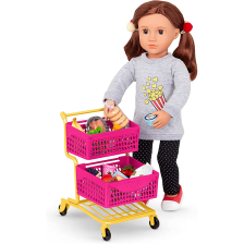 Un caddie spécialement conçu pour les poupées de la marque Our Generation Ce kit comprend un caddie à deux étages pour faire les courses! De nombreux accessoires sont inclus: bouteille de jus, fruits, poulet rôti, salade, cookies Les poupées et tenues sont vendues séparément.