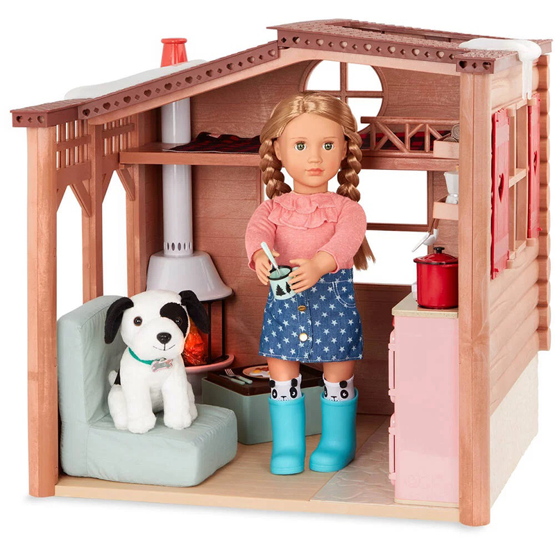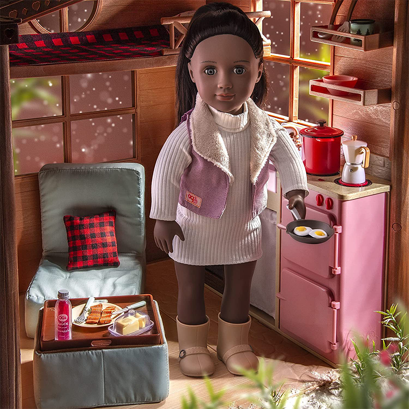 Un chalet de ski pour poupées de 46 cm Our Génération. Il comprend différents accessoires: cafetière, bol, œufs au plat, bouteille de jus, bouteille de lait…. La cuisinière s'allume lorsque vous tournez les boutons et la cheminée est sonore et lumineuse !