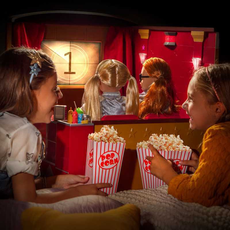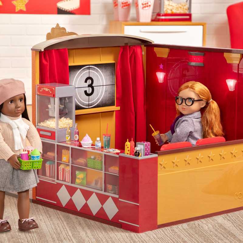Un véritable petit cinéma pour poupées Our Generation. Le cinéma comprend différents accessoires que l'on retrouve dans un cinéma Une machine à popcorn fonctionnelle, des affiches de cinéma que l'on peut modifier et un guichet lumineux. Possibilité d'utiliser une tablette ou un smartphone en écran de cinéma.