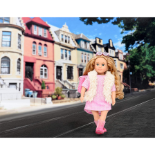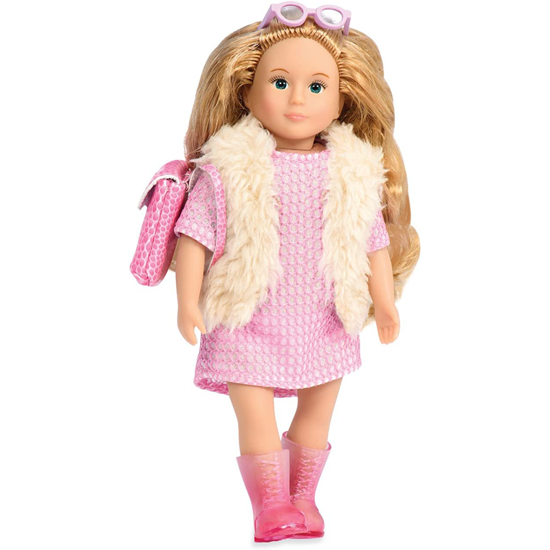 La poupée classique Nora Lori est une poupée de 15 cm aux cheveux blonds, yeux verts et peau claire. Elle porte une robe rose, un gilet sans manches en fausse fourrure, une paire de bottes rose, un sac à dos rose et une paire de lunettes.