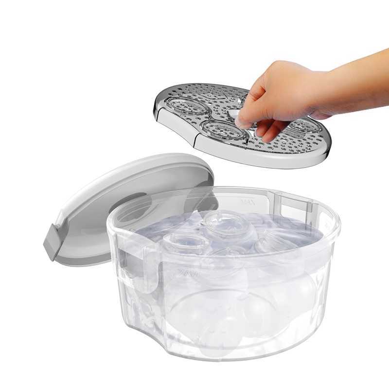 Spécialement conçu pour la stérilisation à la vapeur (au micro-ondes) ou pour l'eau froide avec une solution stérilisante, le stérilisateur combiné vital baby® NURTURE ™ 2 en 1 est rapide et facile à utiliser et est parfait pour une utilisation en voyage.
